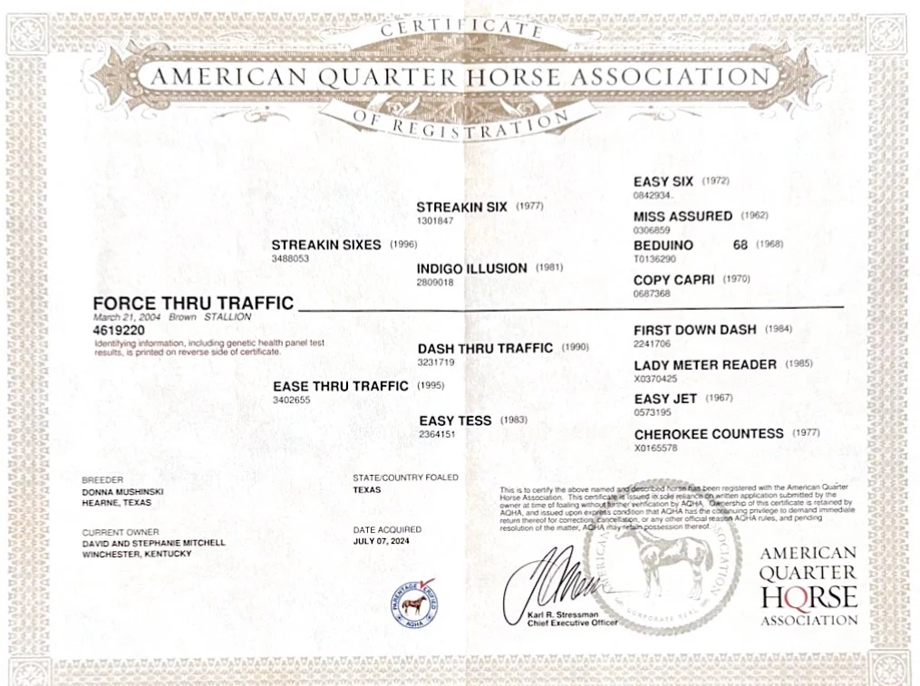 With generations of elite genetics behind him, Force Thru Traffic isn’t just a racehorse—he’s a living thread in the fabric of Quarter Horse greatness. Whether passing along that speed to his foals or standing proud on the farm, Texas is built to carry the fire of champions.