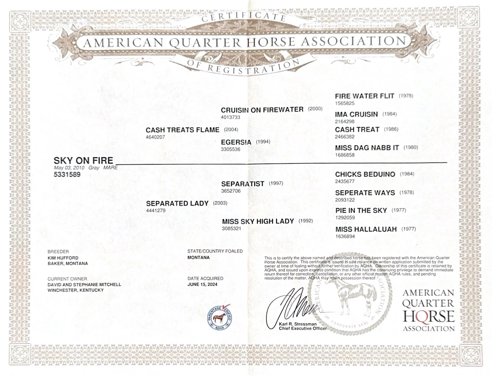 Through Cash Treats Flame’s dam Egersia, Sky’s bloodline also runs back to Cash Treat, a son of Dash For Cash—arguably the most influential racehorse in AQHA history. Dash For Cash earned $507,000, posted a Speed Index of 114, and won two AQHA World Champion Running Horse titles before becoming a Hall of Fame sire of over $39 million in earners.